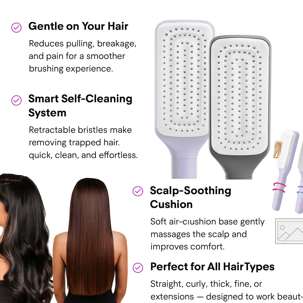 Experience brushing like never before. This self-cleaning hair brush glides smoothly through knots and tangles — reducing breakage and keeping your hair looking healthier every day.